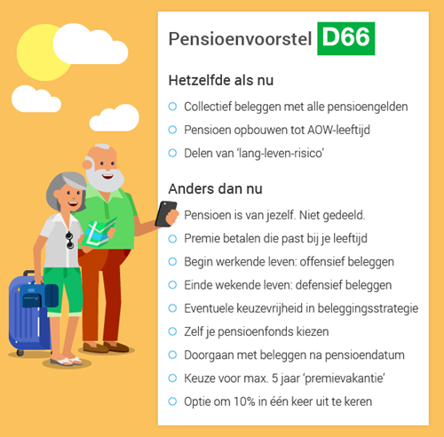“Op dit moment is het pensioengeld van iedereen en tegelijkertijd van niemand”, zo vertaalt D66 het gevoel dat leeft bij de Nederlanders. Zou je zelf je pensioen opbouwen in een eigen spaarpot, dan verdwijnt dat gevoel. Een beetje zoals bij de bankspaarhypotheek dus. Zelf sparen op een geblokkeerde rekening, in dit geval voor je (aanvullend) pensioen.
