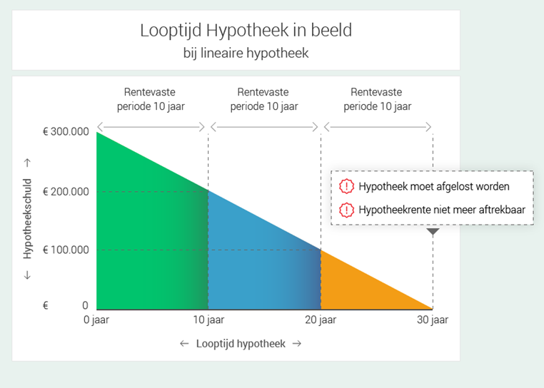 Kan het zinvol zijn om te kiezen voor een kortere looptijd hypotheek? Ja. Stel je sluit een lineaire hypotheek van € 300.000. Na tien jaar heb je ongeveer € 100.000 afgelost. Je hypotheeklening bedraagt dan nog € 200.000. Omdat je rentevaste periode na 10 jaar is geëindigd, kun je zonder problemen overstappen naar een nieuwe aanbieder.