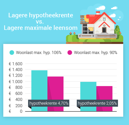 Stel: je mocht maar 90% lenen, conform het voorstel van DNB. Je maximale hypotheek bedroeg dan € 225.000. De hypotheekrente was nog steeds 4,70%. De bruto hypotheeklast daalt dan naar € 1.167. Minder lenen had je dan € 207 per maand bruto gescheeld.