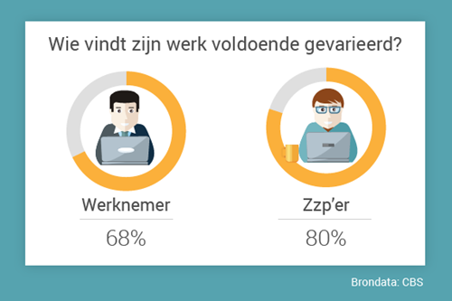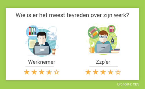 Zelfstandigen werken vaker in hun eigen vakgebied dan mensen in loondienst. Bovendien ervaren zzp'ers minder werkdruk; ze geven minder vaak aan tot over hun oren in het werk te zitten of zich gedwongen te voelen extra snel en hard te werken. Allemaal factoren die volgens het CBS maken dat zzp'ers meer tevreden zijn met hun werk.