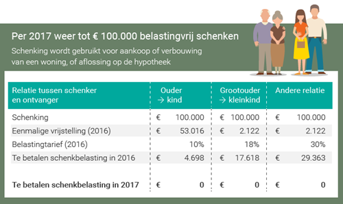 Goed nieuws voor ouders die hun kinderen willen helpen bij de aankoop van een eerste huis. Per 2017 is het weer mogelijk om eenmalig tot € 100.000 belastingvrij te schenken. De belangrijkste voorwaarde is dat het geld besteed wordt aan een verbouwing, de aankoop van een huis of de aflossing van een hypotheekschuld. Dat is bijna een verdubbeling van de huidige maximale belastingvrije schenking.