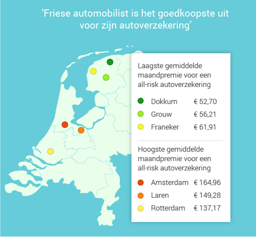 Mensen in Friesland zijn het goedkoopst uit voor hun autoverzekering, zo blijkt uit onderzoek onder verzekeraars.