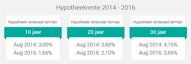 Hoe sterk de hypotheekrente is gedaald, blijkt wanneer we de laagste hypotheekrente in augustus 2014 vergelijken met de huidige rente. Daarbij bekijken we hypotheken met een rentevast termijn van 10, 20 en 30 jaar.