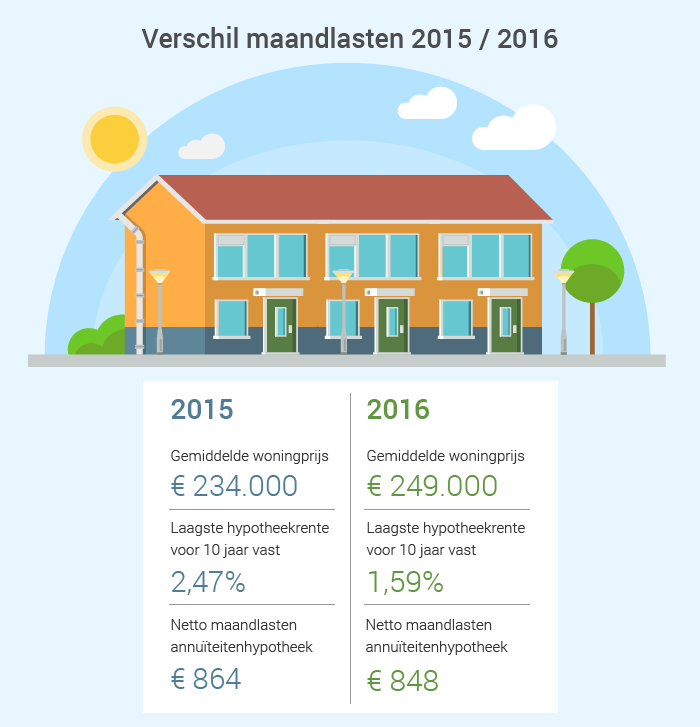 De gemiddelde verkoopwaarde van een huis is op dit moment € 249.000. Dat is € 15.000 meer dan in september 2015. In de tussentijd daalde de hypotheekrente ook. De vraag die je kunt stellen, is wat dat doet met je maandlasten. Is wonen in 2016 nog steeds goedkoper, ondanks de gestegen aankoopprijs van je huis?