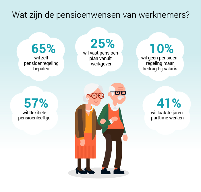 Ruim de helft van de mensen in loondienst zou het liefst in samenspraak met hun werkgever een duidelijk pensioenplan opstellen. Die mogelijkheid bieden bedrijven nog veel te weinig. Een andere wens is bijvoorbeeld een verplicht basispensioen plus een gedeelte dat werknemers zelf kunnen invullen.