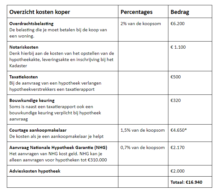 Bij veel woningen op Funda zie je achter de huizenprijs “k.k.” staan. Dit staat voor kosten koper. Hiermee wordt bedoeld dat de bijkomende kosten bij de koop voor rekening van de koper zijn. Deze kosten kun je sinds 2018 niet meer meefinancieren met je woning. Koop je een bestaande woning van €310.000, houdt dan rekening met de volgende kosten: