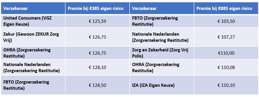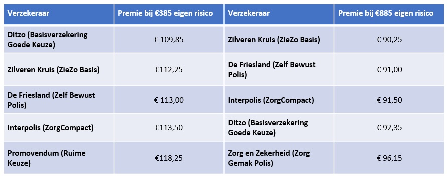 Onderstaand de laagste premies bij het standaard eigen risico en het maximaal verhoogde eigen risico van € 885.