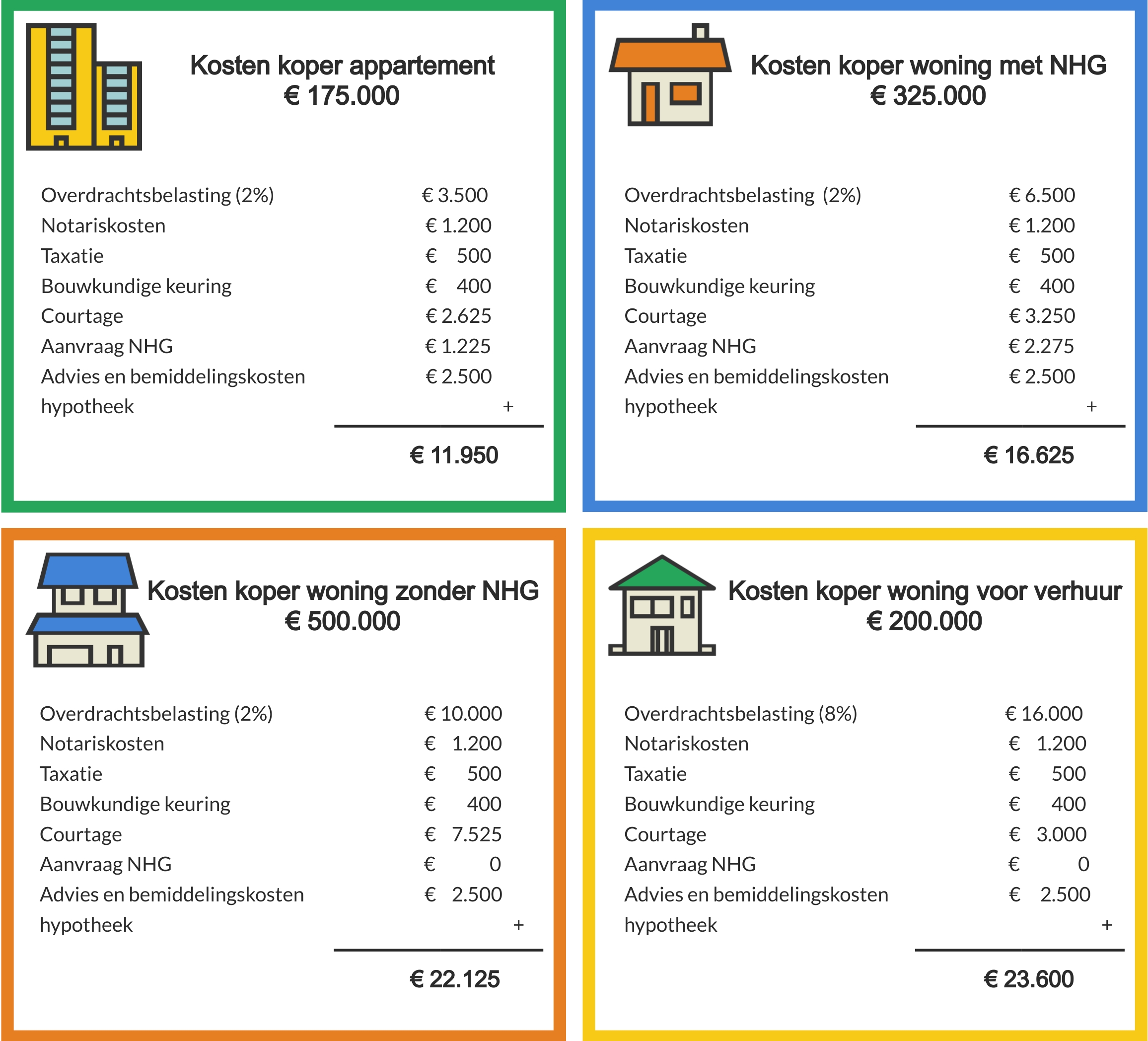 Omdat de kosten koper voor een groot deel afhangen van de koopsom, verschilt het totale kostenplaatje per prijscategorie. Onderstaand enkele voorbeelden, variërend van een basis startersappartement tot een relatief dure woning. Daarbij maken we ook onderscheid in wel of geen Nationale Hypotheek Garantie (NHG) en wordt een woning voor de verhuur meegenomen.