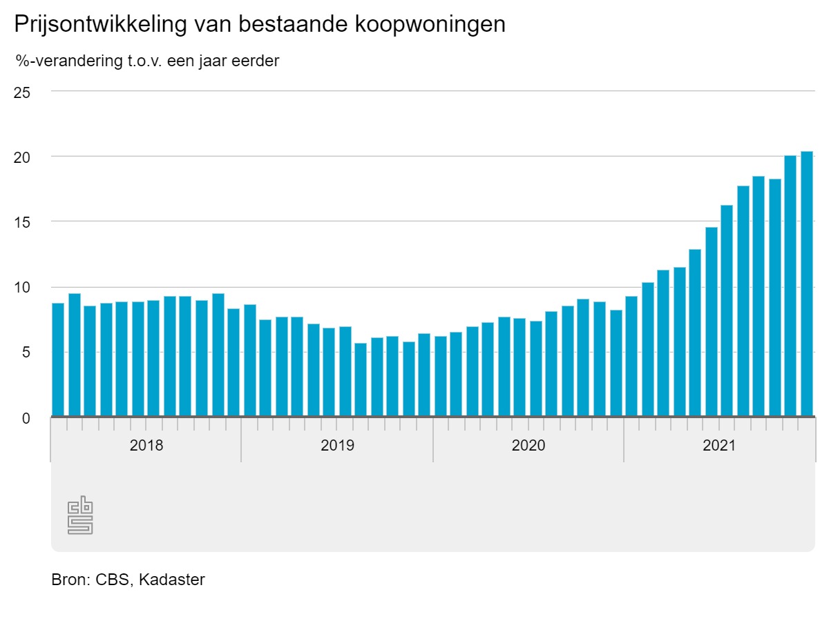 Kocht je in december een woning, dan betaalde je gemiddeld 20,4 procent meer dan een jaar eerder. Dit is de grootste stijging sinds het CBS de woningprijzen publiceert. Met de cijfers van december is ook het totaal over 2021 bekend. Vooral in de tweede helft van het jaar zijn woningen fors meer waard geworden.
