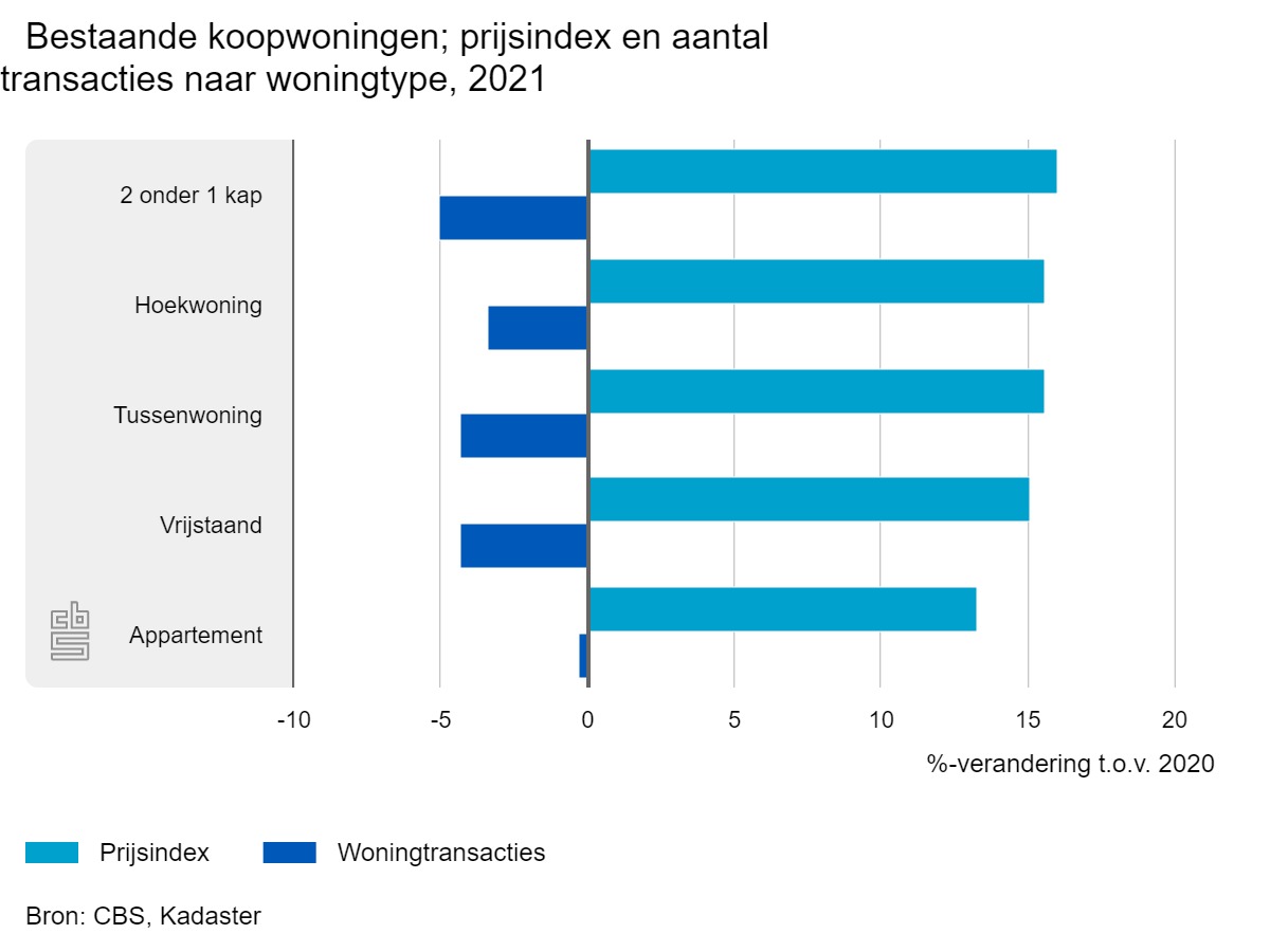 Ongeacht het type woning nam de gemiddelde prijs vorig jaar toe, ten opzicht van een jaar eerder. Twee-onder-één-kapwoningen spande de kroon met een stijging van 16 procent. Het kleinst was de prijsstijging voor appartementen (13,3 procent). Dit type woning is ook relatief veel verkocht, het aantal transacties was bijna hetzelfde als in 2020. Dit terwijl er bijvoorbeeld vijf procent minder twee-onder-één-kapwoningen zijn verkocht.