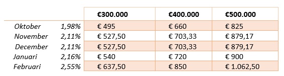 De onderstaande bedragen geven aan wat je bruto kwijt bent aan rente. In de praktijk komt hier vaak de aflossing bovenop, tenzij je een aflossingsvrije hypotheek hebt. Daarnaast heb je mogelijk het voordeel van hypotheekrenteaftrek, waardoor de netto last lager ligt.