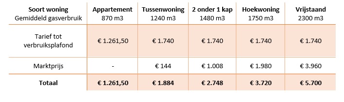 Wanneer je meer verbruikt dan het gestelde plafond, ga je over het meerdere de marktprijs betalen. Om hier een beeld van te geven, zetten we het gemiddelde verbruik op een rij voor verschillende type woningen. Daarbij houden we een gasprijs aan van € 3,60 per m3 en een stroomprijs van € 0,80 kWh. Uiteraard kan het plaatje er anders uitzien als de energietarieven stijgen of dalen.