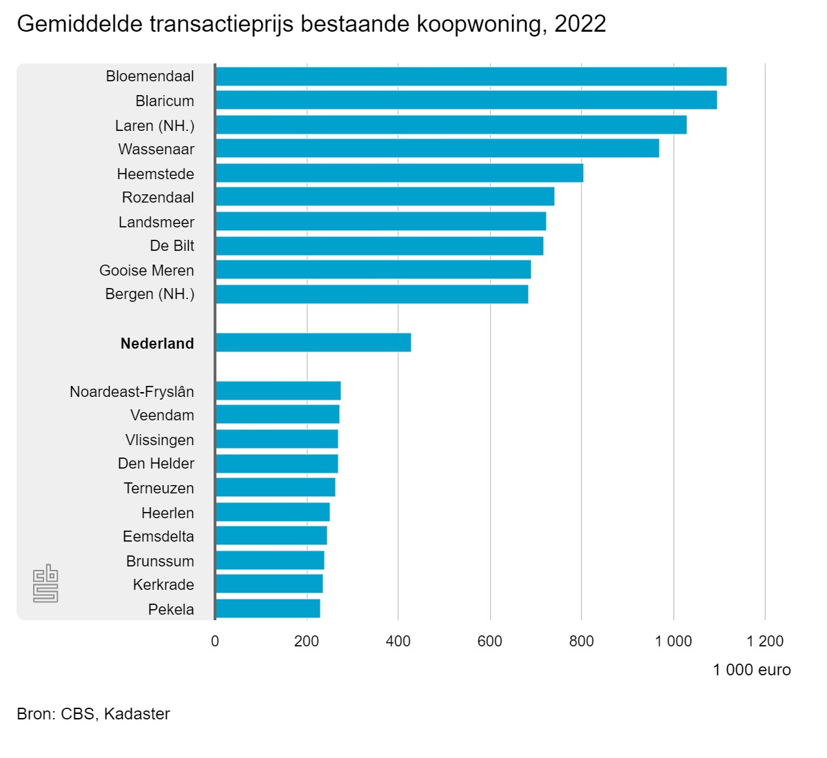 De gemiddelde verkoopprijs van bestaande woningen was in 2022 € 429.000. Dit is de hoogte prijs sinds het begin van de metingen in 2022. Dit blijkt uit cijfers van het Centraal Bureau voor de Statistiek (CBS).