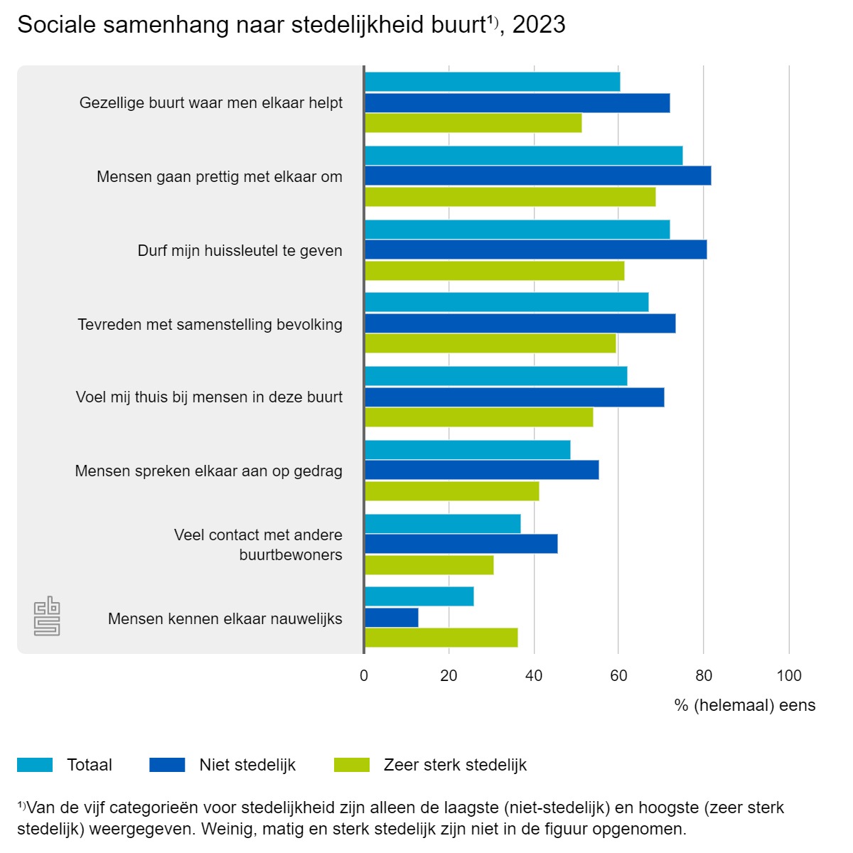 In Rotterdam vindt slechts 46% van de inwoners dat ze in een gezellige buurt wonen, wat het laagste percentage is onder gemeenten met 70.000 of meer inwoners. Aan de andere kant scoort Land van Cuijk het hoogst, met 75% van de bewoners die hun buurt als gezellig beschouwen. In bijvoorbeeld Meierijstad, Hoeksche Waard, en Súdwest-Fryslân vindt ongeveer 70% van de inwoners hun buurt ook gezellig. Ondanks lagere percentages in steden als Amsterdam en Den Haag, scoren grote gemeenten nog steeds voldoende op het gebied van sociale samenhang.